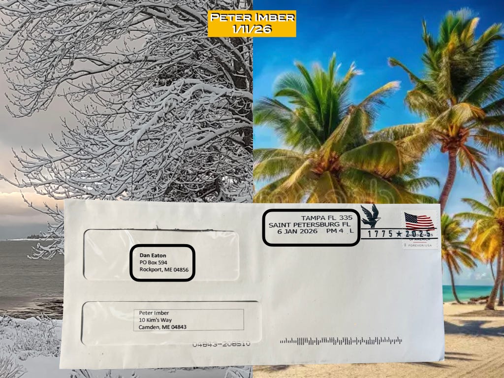 You see a lot of Florida license plates in Maine in the summer. They return north with all the other birds. And for those of us who might be thinking of spreading our own wings south there’s a local radio commercial with a guy who claims to be “Your Maine go-to real estate agent for property in the Sunshine State.”