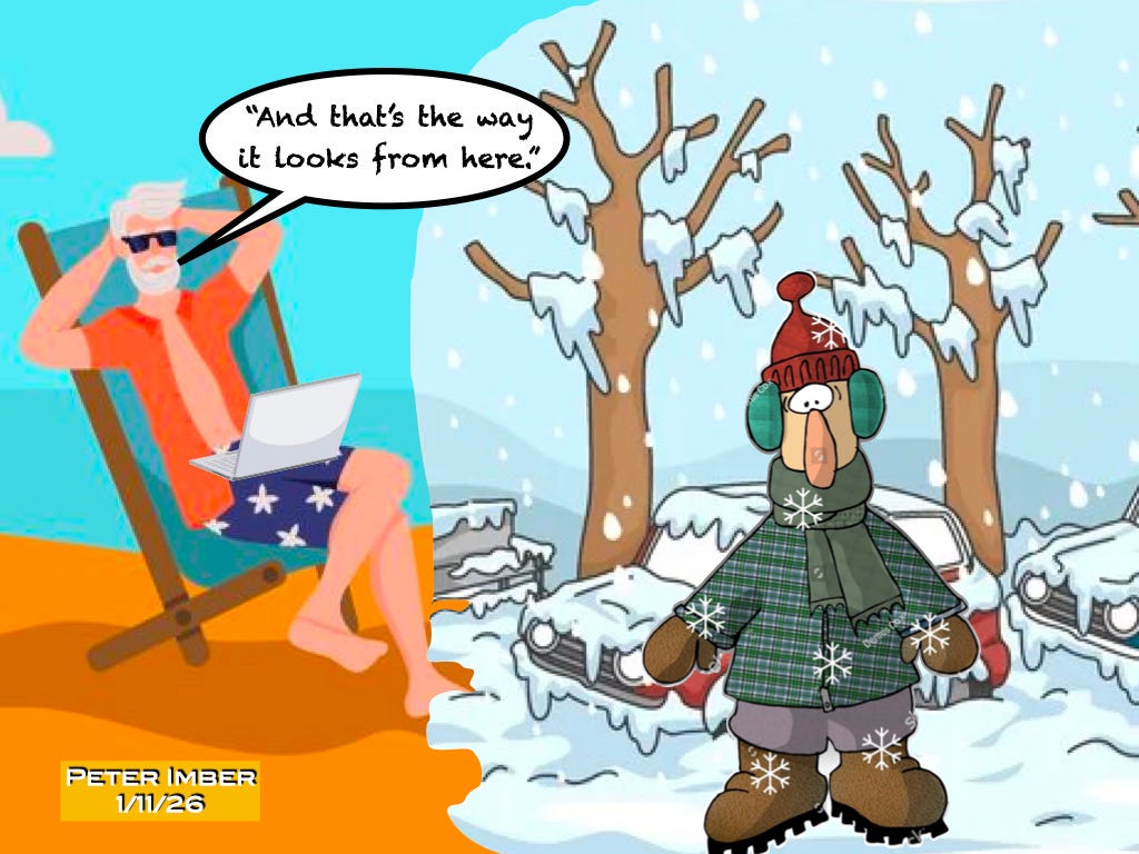 McNally’s signature signoff line is “That’s the way it looks from here” but as I’ve now learned, he’s not HERE! He’s like the guy I have relaxing on the beach in the cartoon and when he’s telling us listeners in Maine how cold it’s going to be, he does it from Florida where he lives in the winter, if not most of the year, and his outdoor thermometer will reach 70 degrees today.