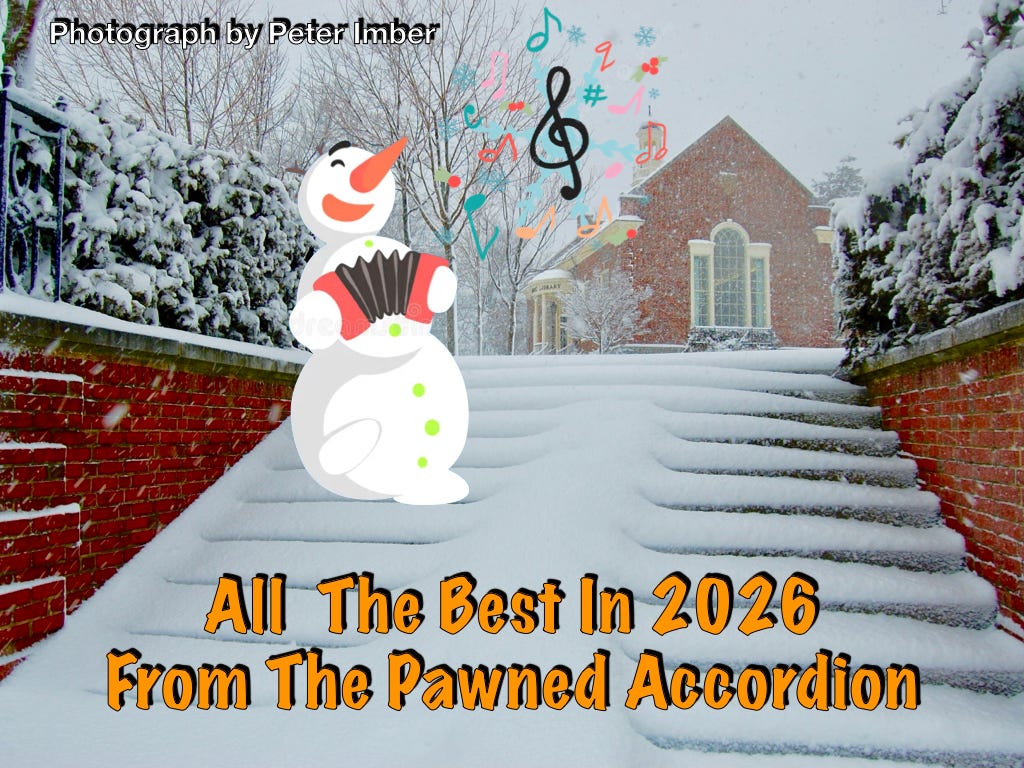 I can predict two things for sure about 2026. The first is that it won’t be hard to find fresh material for The Pawned Accordion. The other… Wait! I’m sorry, I forgot what it was. Hey, I guess that’s one of the benefits of being another year older. For example take my New Year’s resolutions. I already don’t remember what they were!