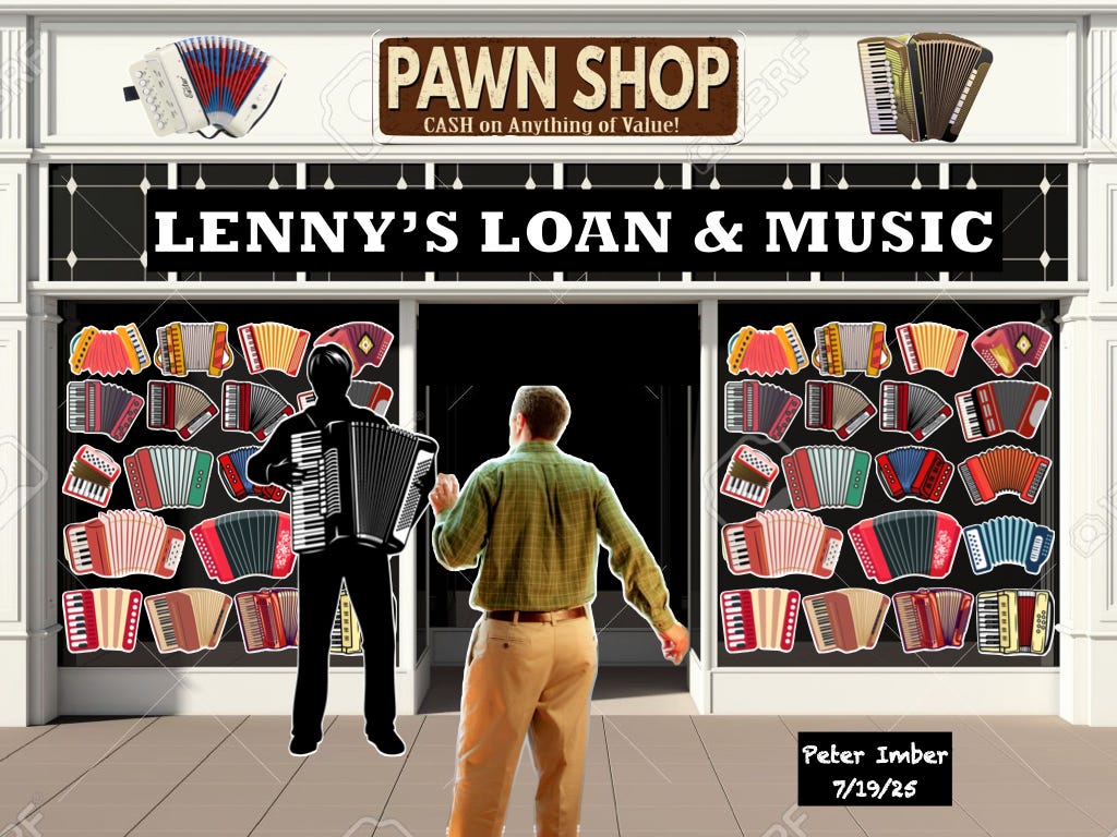 I began doing cartoons on April 1,2020. The COVID pandemic had just started to isolate us physically from each other and for 365 straight days I did cartoons and also began adding stories and observations. I called my stuff Homemade Cartoons and created my Substack in the summer of 2024 and Homemade Cartoons became The Pawned Accordion.