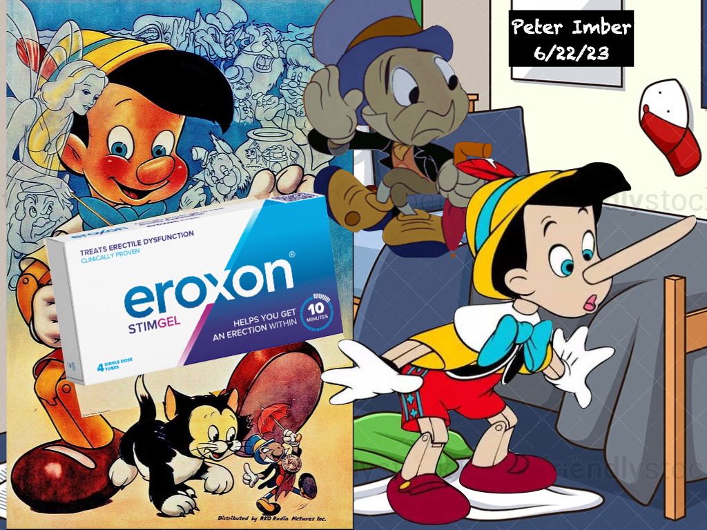 My last Homemade Cartoon was of Pinocchio using a new drug for enhancing erectile function called Eroxon which had enlarged his nose and not its intended target.