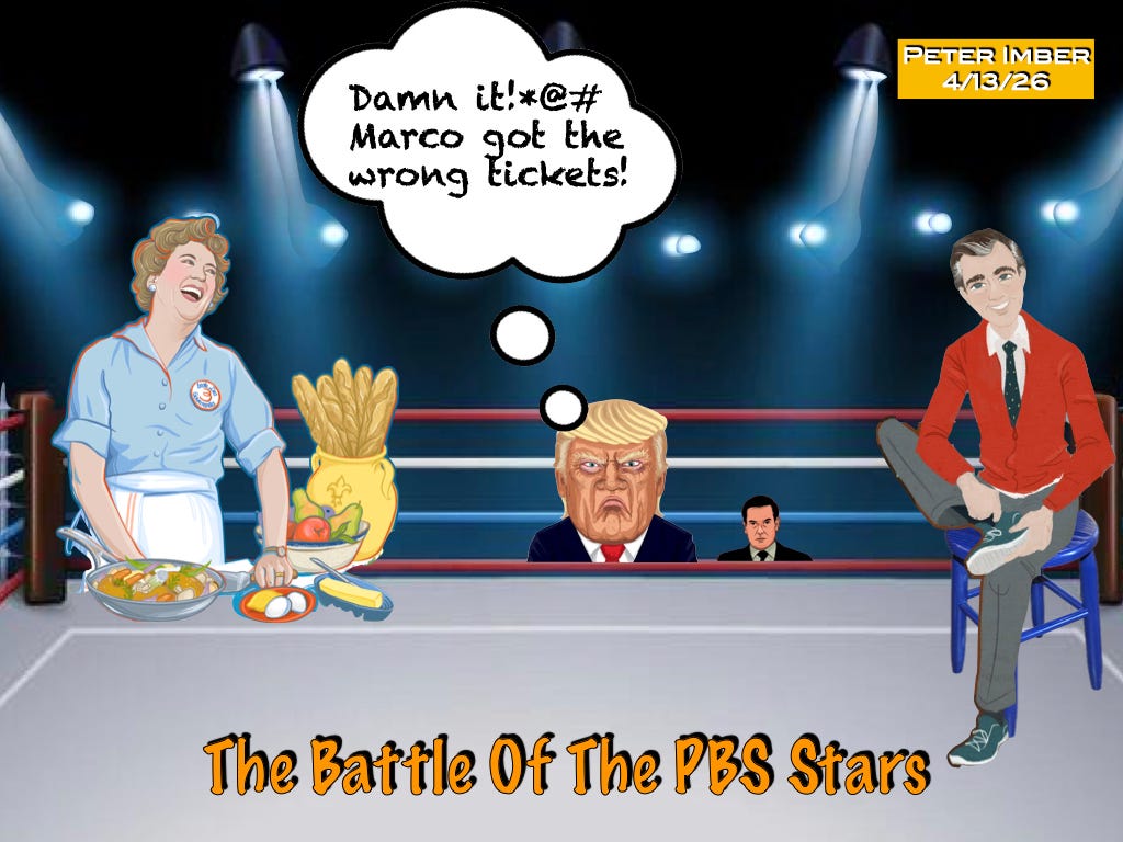 APRIL 11— No, President Trump is not viewing Julia Child and Fred Rogers fighting on PBS. Instead Trump attends a mixed martial arts event in Miami with his Secretary of State Marco Rubio. While watching men battering each other silly in a cage, it is unclear whether he is informed that the United States negotiations with Iran taking place in Pakistan have broken off in failure.