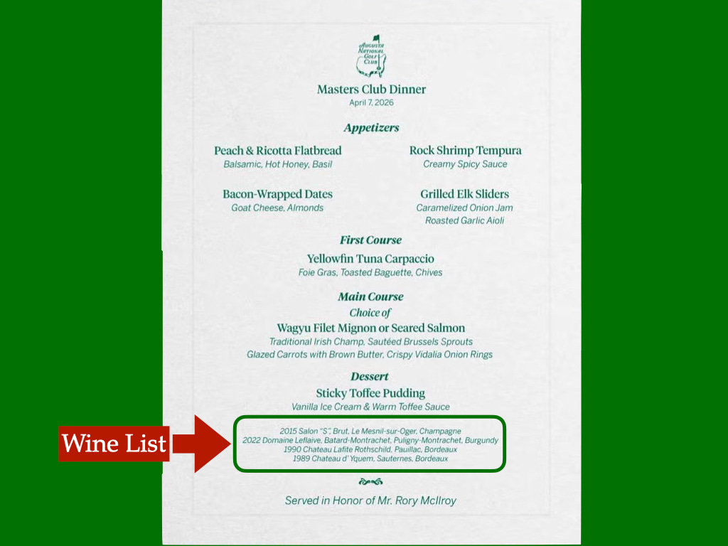 The most recent champion is always the host and has the privilege of planning the meal. This year that honor fell to the Northern Irish player Rory McIlroy, whose dinner menu in addition to grilled elk sliders and yellowfin tuna carpaccio…