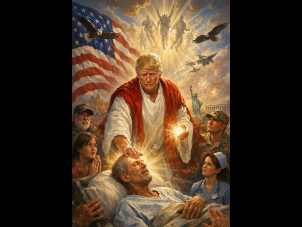 Back at the White House Trump tries to explain away to reporters a photo he earlier had posted of himself robed as a Jesus-like figure.